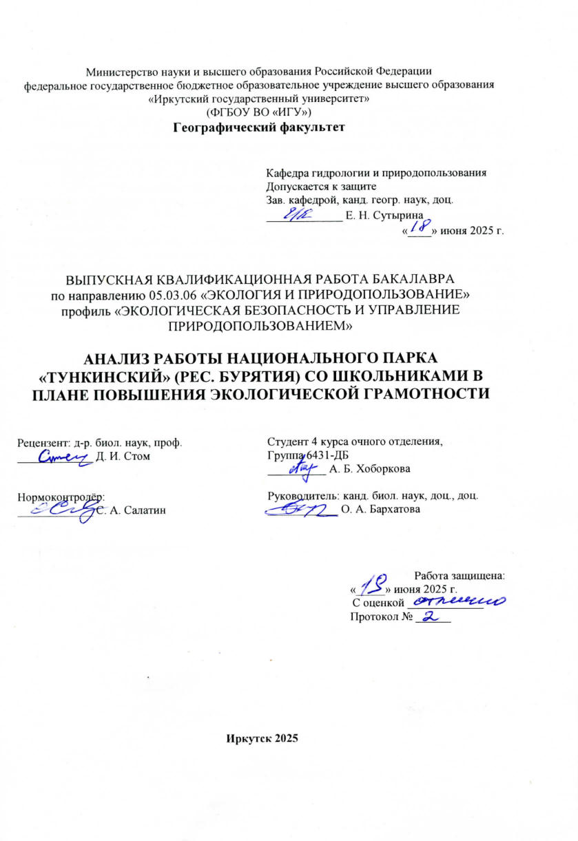 Анализ работы Национального парка "Тункинский" (Рес. Бурятия) со школьниками в плане повышения экологической грамотности : ВКР бакалавра