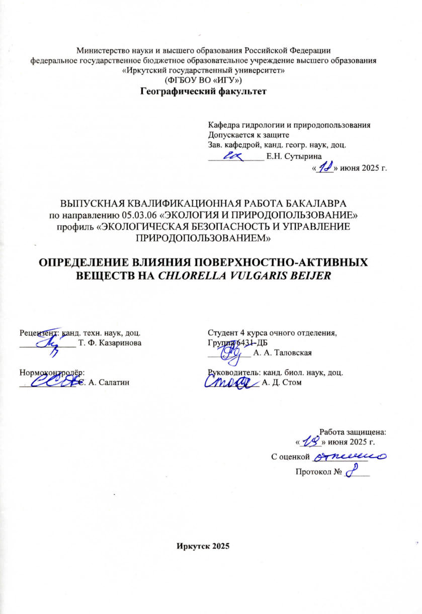 Определения влияния поверхностно-активных веществ на Chlorella vulgaris Beijer : ВКР бакалавра