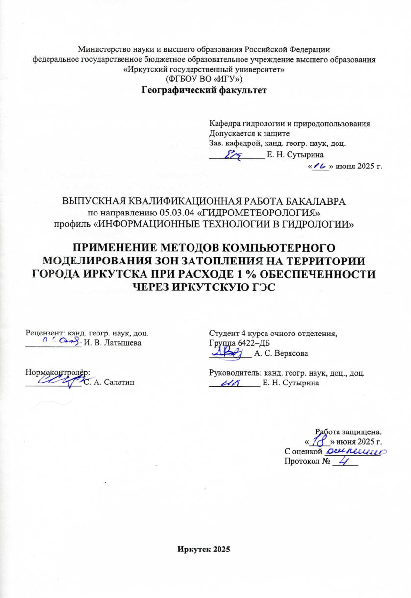 Применение методов компьютерного моделирования зон затопления на территории города Иркутска при расходе 1% обеспеченности через Иркутскую ГЭС : ВКР бакалавра