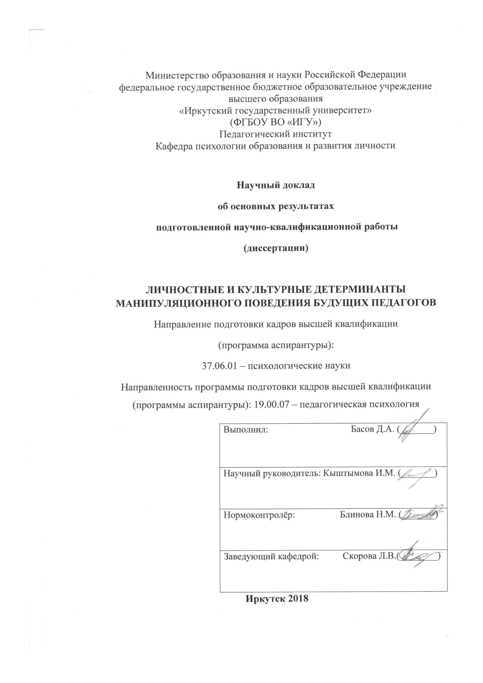 Направление 37.06.01 "Психологические науки", направленность 19.00.07 "Педагогическая психология".